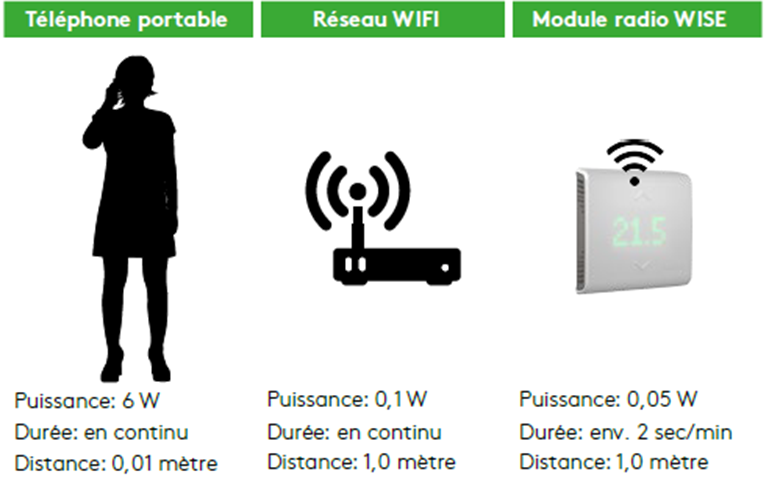L’exemple de calcul ci-dessous illustre clairement la différence entre le système de radio fréquences et d’autres systèmes que nous utilisons tous les jours. Un téléphone mobile émet avec une puissance plus élevée et est utilisé beaucoup plus près du corps qu’une borne Wi-Fi ou qu’un nœud radio WISE. Ainsi, un appel téléphonique de 2 minutes et demie correspond à la même exposition aux ondes que :