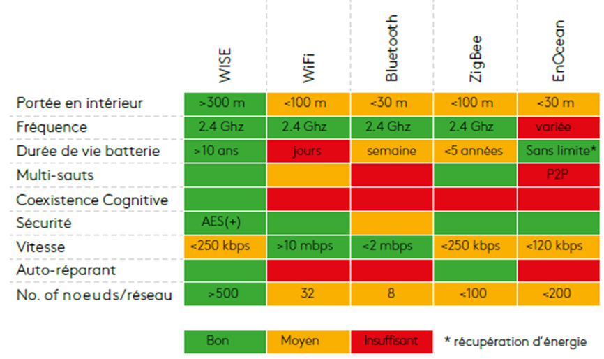 WISE intègre une technologie brevetée de coexistence cognitive. Celle-ci détecte les autres réseaux présents et sélectionne automatiquement le canal le plus adapté. L’objectif est de limiter les interférences et de maintenir des communications fiables, en particulier dans des environnements sensibles (par exemple hôpitaux ou aéroports).